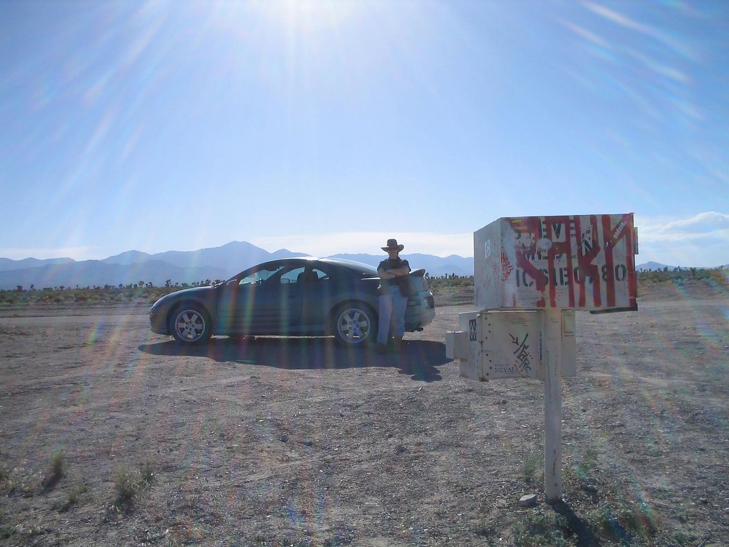 On the way towards Vegas, we also stopped at the ALSO famous "black mailbox" on Mailbox Road. This is the only human landmark for miles in this area, and also a spot that provides one of the best (legal) views of the airspace over the base. Its a popular and quite well known meeting place for people who want to go UFO hunting. (And don't let the color fool you--the original mailbox was black, until the rancher who owned it got sick of UFO hunters stealing it. So he bought another one and painted it white to try and throw them off. As you can see, it didn't work):