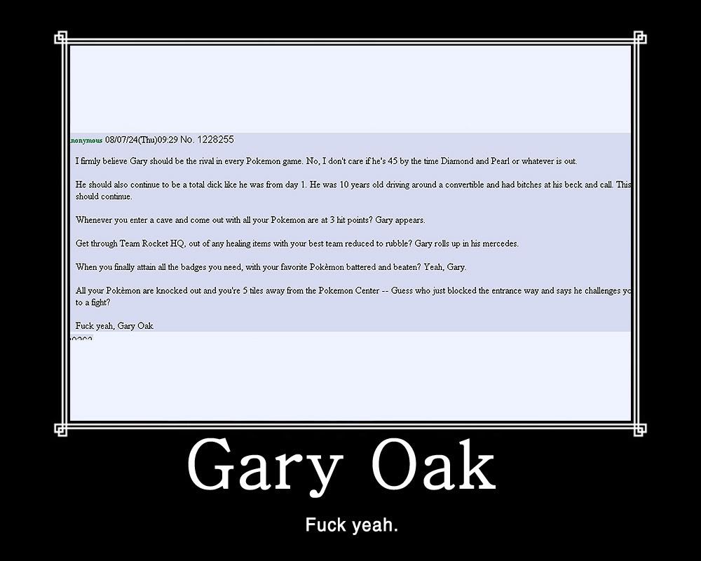 On the topic of Gary, in my first game I named him BITE ME. For some reason I thought it was hilarious back then when at the beginning of the game some text read "BITE ME: Gramps!"