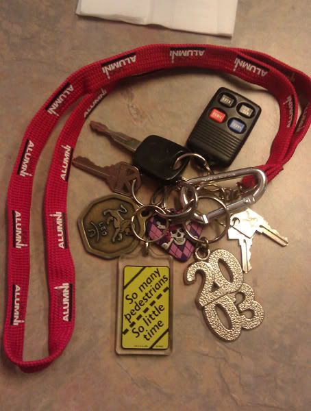 Most of it is pretty self-explanatory I think. The long red thing says I'm an alumni of my university, which is something I'm quite proud of (it also keeps me from ever losing my keys in my purse lol). I have several keys, which are for my car, the house, and the file cabinet in my room. The 2003 is the year I graduated high school. Everything else is decoration and flavor I suppose.