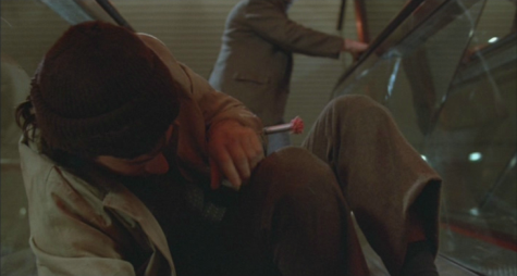 Our story begins in one of the places top five places where you're most likely to find poor people: show me mall food court! Cameron wanders around the food pavillion bumming food and smokes from people until he finds an empty table with a half-eaten hotdog. Being the classy guy that he is, he picks it up and eats it. As fate would have it, two hideous middle-aged ladies see him do it and start making fun of him. He stares at them and one of them starts shaking and screaming and shit. At the point in the movie, the existence of scanners has not yet been explained, so the viewer might assume that the lady is going through an extremely difficult menopause. As the woman thrashes about, people in the food court start to take notice and begin to wonder what the hell is wrong with her; now she will know how it feels to be stared at.