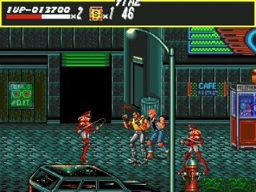 Special attacks are a staple of beat 'em up games. These attacks are generally much more powerful than your basic attacks, but they should only be used to get you out of a tight spots because of various limitations imposed on them. For example, Golden Axe required you to collect and use magic potions in order for your character to execute a special attack. In Capcom games like The Punisher or Cadillacs and Dinosaurs, special attacks cost life to use. In Streets of Rage, the special attack system is even more simplistic: you get one special attack per level, except for the last level where you get none. In later levels, you may find a miniature police car lying around. This will give you an extra special attack. If you die during a level, your special attacks will be reset to 1. Obviously, this is good if you have zero left and not to so good if you have two. Thus, always use your special attack if you're about to die. What is the special attack, anyway? Well, it's like this: according to the game manual, pressing the special attack button allows your ex-cop to summon the "one good guy left on the force" and damn is this guy loyal. No matter where you are, whether it's the ghetto, the beach, a condemned bridge, or even a boat crusing around the city's harbor, Police Guy will pull up in his car and fire his rocket launcher. His attack will instantly kill most lesser enemies and severely damage bosses. Unless you're pratically dead or borderline retarded, you should always save your special attacks for the end of the level.